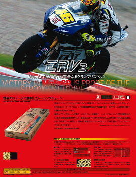 過酷なグランプリシーンで鍛え上げられたレース専用チェーンとしてのノウハウを受け継ぎながら、新たな開発思想を盛り込み、従来品に比べ引張り強さ5%向上、疲れ強さ15%向上を達成、さらに段付きピンの採用による強度と軽量化のバランスのとれた、正真正銘のグランプリスペックとなっております。