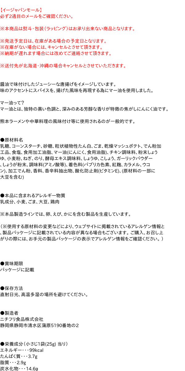 ●原材料名 乳糖、コーンスターチ、砂糖、粒状植物性たん白、ごま、乾燥マッシュポテト、でん粉加工品、食塩、食用加工油脂、マー油(にんにく、食用油脂)、チキン調味料、粉末しょうゆ、小麦粉、ねぎ、のり、酵母エキス調味料、しょうゆ、こしょう、ガーリックパウダー、しょうが粉末、調味料(アミノ酸等)、着色料(パプリカ色素、紅麹、カラメル、ウコン)、加工でん粉、香料、香辛料抽出物、酸化防止剤(ビタミンE)、(原材料の一部に大豆を含む) ●本品に含まれるアレルギー物質 乳成分、小麦、ごま、大豆、鶏肉 ※本品製造ラインでは、卵、えび、かにを含む製品を生産しています。