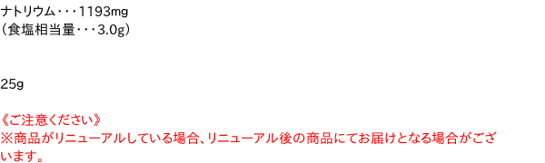●製造者 ニチフリ食品株式会社 静岡県静岡市清水区蒲原5190番地の2 ●栄養成分(小さじ1袋(25g) 当り) エネルギー・・・99kcal たんぱく質・・・3.7g 脂質・・・2.9g 炭水化物・・・14.6g ナトリウム・・・1193mg (食塩相当量・・・3.0g) 25g【広告文責】株式会社イージャパンアンドカンパニーズ 072-875-6666《ご注意ください》 ※商品がリニューアルしている場合、リニューアル後の商品にてお届けとなる場合がございます。