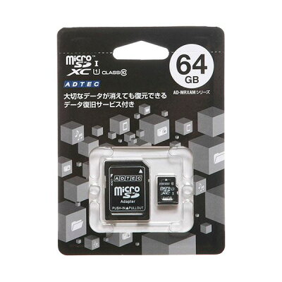 ※アドテックデータ復旧サービス係 0120-59-7109(携帯からは03-3541-5062)■商品スペックメモリー種類:microSDXC容量:64GBスピードクラス:Class10、UHS-I転送速度:40MB/s寸法:W15×D1×H11mm質量:約0.4gその他仕様:●プロテクト:SDアダプタ使用時ライトプロテクト機能あり●保護:データセキュリティ機能 SDMI準拠●電源電圧:2.7〜3.6V●温度:使用温度範囲 0〜60℃(動作時)、-20〜85℃(保存時)●湿度:使用湿度範囲 95%以下(動作時)、93%以下(保存時)●サポート:SDモード、SPIモード●防水:JIS IPX7に適合付属品:SD変換アダプタ保証期間:5年備考:※変換アダプタは防水ではありません。