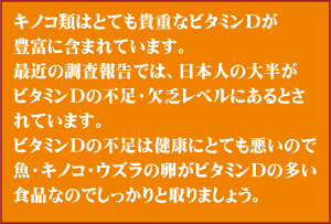 ビタミンⅮの不足は健康にとても悪いので 魚・キノコ・ウズラの卵が ビタミンDの多い食品なので しっかりと取りましょう。